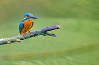 IJsvogel mannetje (Alcedo atthis) zittend op een tak met uitzicht op een kleine vijver tijdens de lente. De ijsvogel is ook bekend als de Euraziatische ijsvogel, en de rivier ijsvogel.