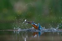 ijsvogel heeft een visje opgedoken en komt net weer boven het water uit. Spiegelling met veel druppels. Foto is in Overijssel in Nederland gemaakt.