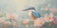 Een kleurrijk digitaal schilderij van een kleurrijke IJsvogel omringt door bloemen Het werk geeft een dromerige en klassieke uitstraling aan uw interieur!