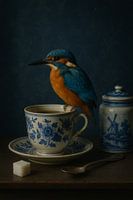 Een kleurrijke ijsvogel balanceert sierlijk op een kopje met Delfts blauw decor, omringd door suiker, een lepel en een klassiek voorraadpotje. Deze compositie combineert de charme van oude meesters met een moderne knipoog naar Nederlandse cultuur.