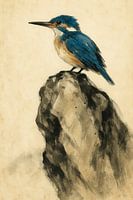 Deze sfeervolle illustratie toont een majestueuze ijsvogel die trots op een verweerde rots zit, uitgevoerd in een stijl die doet denken aan traditionele Oost-Aziatische penseelkunst. De zachte achtergrond en sprekende blauwe tinten brengen rust, kracht en natuur samen in één betoverend beeld.