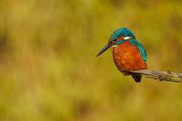 Deze ijsvogel is een van e mooiste vogel die Nederland rijk is. De ijsvogel zit rustig op een tak opzoek naar wat voedsel in zijn natuurlijke omgeving. Door de gelige achtergrond steek de ijsvogel mooi af.