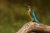 Een blauwe vogel genaamd ijsvogel zit op een tak boven het water te speuren naar vis.