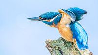 Prachtige ijsvogel op een stronk. Op een serene blauwkleurige achtergrond. Mooi plaatje voor aan de muur!