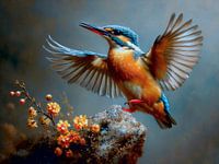 Een muurschildering als decoratieve kunst voor een stijlvol interieur. Een kleurrijke ijsvogel vliegt met uitgestrekte vleugels en landt op een rots versierd met oranje bloemen.