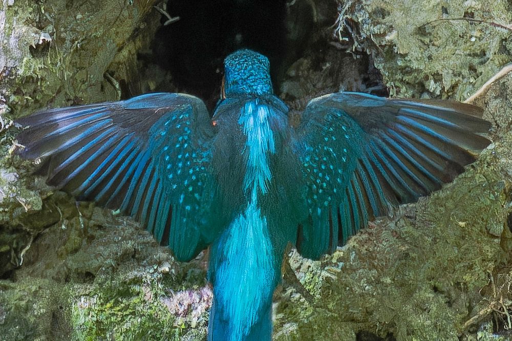 De IJsvogel graaft zijn nest in een aarden wal. Op deze foto is te zien hoe een IJsvogel met gespreide vleugels het nest nadert. De foto is genomen in Amsterdam- nieuw West waar het prachtige vogeltje het goed doet!