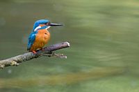 IJsvogel (Alcedo atthis) ook bekend als de Eurasische ijsvogel, en rivierv ijsvogel zittend op een tak met uitzicht op een kleine vijver. Het mannetje is herkenbaar aan de zwarte onder en bovensnavel. Het vrouwtje heeft een oranje ondersnavel.