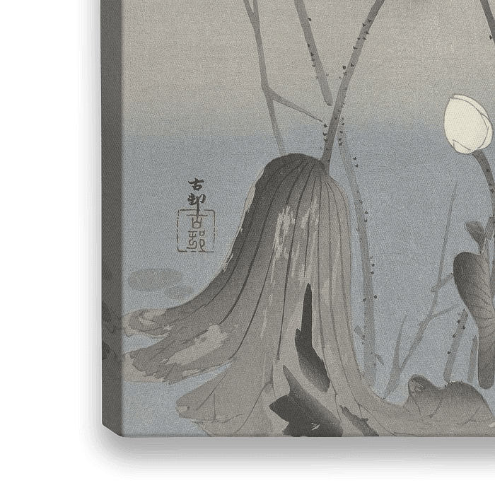 Koop IJsvogel zittend op gebogen stengel bij witte lotusbloem van Ohara Koson als reproductie op canvas, aluminium dibond, (ingelijste) fotoprint, behang en ArtFrame, op maat geprint in Fine-Art kwaliteit.