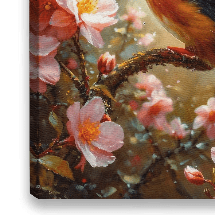 Een muurschildering als decoratieve kunst voor een stijlvol interieur. Omringd door een zee van lentebloesems aan een boom in volle bloei, landt een ijsvogel op een tak van deze boom.
