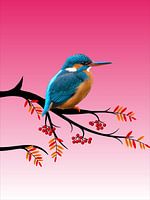Het digitale kunstwerk “IJsvogel” toont een verstilde scène vol elegantie en symboliek. Centraal in het beeld zit een ijsvogel, minutieus uitgewerkt met iriserende blauwtinten en koperachtige accenten in zijn verenkleed. De vogel zit roerloos op een fijne, licht gebogen tak, die doet denken aan de sierlijke lijnen van Japanse penseelkunst. De tak lijkt uit het niets te komen, verbonden aan een onzichtbare boom buiten het kader van de compositie, wat de scène een mystiek, bijna dromerig karakter geeft.