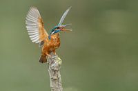 Een IJsvogel met haar vleugels geheel open en met de snavel open op een tak met een soft groene achtergrond