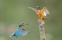 Een ijsvogel met de vleugels geheel open en de snavel ook open omdat er nog een ijsvogel langs vliegt, met een groene achtergrond.