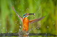 Met zijn vleugels volledig open komt deze kleine visser met zijn vangst weer boven water.