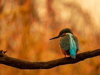 Een IJsvogel op een tak. Geelbruine bladeren op de achtergrond. Kenmerkende en opvallende blauwe rugstreep van de ijsvogel is goed zichtbaar.