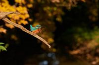 Een grappige pose van dit ijsvogeltje in de mooie herfstsfeer. Wat kleiner in beeld gebracht in zijn leefomgeving, versterkt door de herfstkleuren.