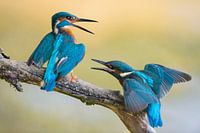 IJsvogels (Alcedo atthis) in geschil, volwassen vogel vecht tegen jonge vogels, wilde dieren, Europa.