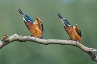 Ze zijn pas enkele dagen uit het nest, deze twee kleine ijsvogeltjes. Veel is nog onbekend voor ze, wanneer er een kraai overvliegt gaan ze allebei instinctief in de zogenaamde paalhouding zitten.