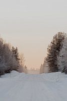 De zachte pastelkleuren in de lucht maken het een kalme print om naar te kijken. De bevroren en platgereden sneeuw op de weg, met de paaltjes (voor de herkenbaarheid van de weg voor de schuivers) maken het een typische plaat van de winter in Lapland.