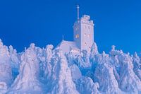 Het weerstation op de Fichtelberg omringd door besneeuwde sparren op het blauwe uur.