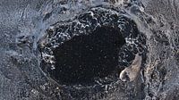Close-up van een kleine ijsberg op het beroemde Diamantstrand in het zuiden van IJsland bij Jökulsárlón met een gat gevuld met zwarte zandkorrels en een glinsterend patroon op het ijzige oppervlak.