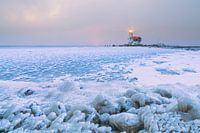 Vuurtoren Paard van Marken (Noord-Holland, Nederland) voor zonsopkomst. Een ijzige kou joeg in ons gezicht. In deze foto heb ik dat kenbaar willen maken door een wat antartische bewerking toe te passen. Maar was een mooi moment en mooie omstandigheden voor landschapsfotografie