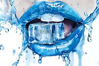 De afbeelding toont een opvallend street art-motief in een schilderachtige stijl. In het midden staan sensuele, lichtjes gesepareerde lippen die een ijsblokje vasthouden. De lippen en het ijsblokje zijn in krachtige blauwe tinten, waarbij de details van water en schaduw er realistisch en levendig uitzien. Het ijsblokje druipt verleidelijk van de lippen en creëert een dynamisch en levendig tafereel.