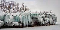 besneeuwde, rotsige oever overangen met ijspegels, meer is bevroren en bedekt met een laag sneeuw. Op de rotsen staan een paar kale bomen.