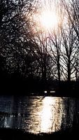 Een felle winterzon schijnt over de dunne ijslaag van de Gorssloot in Purmerend. Het had door opklaringen die nacht flink gevroren, en diezelfde opklaringen lieten de zon de volgende dag flink schijnen. Hier schijnt zij door de kale bomen heen en verlicht de matte ijsvloer met goudgeel licht. Op het ijs zijn wel wat natte waterplekken…