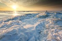 De warme avondzon schijnt over het kruiende ijs van het IJsselmeer. In de verte staan iemand van dit prachtige natuurverschijnsel te genieten.
