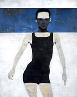Gedurfd, raadselachtig en visueel opvallend, trekt dit hedendaagse kunstwerk de aandacht met zijn opvallende gebruik van contrast en minimalistische palet. De centrale figuur, weergegeven in een strak zwart tegen een lichtgevende witte en diepblauwe achtergrond, roept zowel kracht als kwetsbaarheid op. De meesterlijke penseelvoering en…
