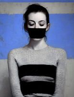 Stap in een wereld van stille intensiteit met "Silenced", een opvallend hedendaags portret dat de aandacht trekt en uitnodigt tot reflectie. Dit suggestieve werk toont een jonge vrouw met haar ogen zachtjes gesloten, haar lippen bedekt door een opvallende zwarte band, tegen een…