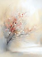 Detail in staand formaat. Impressies van een lentedag. Schilderachtig en abstract gerealiseerd. Kleurrijke struiken met tere bloesems zorgen voor een vleugje kleur en kondigen de komst van de lente aan. Moderne gemengde techniek met acrylverf. ©3-2024 Pia Schneider, atelier KLEUR-VISIE