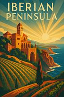 Deze reisposter van het Iberisch schiereiland is een levendig eerbetoon aan de tijdloze landschappen van Spanje en Portugal. De poster is ontworpen in een opvallende art-decostijl en toont wijngaarden met terrassen, kustkliffen en warm mediterraan zonlicht dat over historische architectuur schijnt. Met zijn rijke palet van goud, groen en diep blauw roept het kunstwerk de essentie van de Iberische cultuur op, waar mediterrane charme en Atlantische energie elkaar ontmoeten. Van de wijngaarden van Rioja tot de kustlijn van de Algarve, het Iberisch schiereiland staat bekend om zijn unieke mix van geschiedenis, traditie en natuurlijke schoonheid. Deze poster brengt die sfeer in een modern decoratief stuk dat zowel nostalgisch als stijlvol is. Perfect voor diegenen die Europese bestemmingen, wijnlandschappen en vintage reiskunst koesteren. Het maakt een stoer statement in elke woonkamer, eethoek of creatieve werkruimte. Of je nu Spanje en Portugal hebt verkend of gewoon droomt van hun warmte, dit kunstwerk belichaamt mediterrane reislust en tijdloze elegantie.