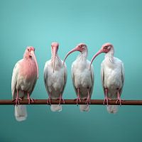 Vier kleurrijke vogels staan op een draad, met witte en roze tinten. Deze hyperrealistische dierenportretten worden gekenmerkt door hun ongekende nauwkeurigheid en gedetailleerde weergave. Ze stralen een exotische charme uit.