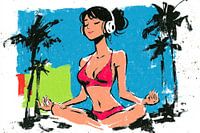 Ibiza Meditatie - Dit schilderij toont een vrouw in een meditatieve pose, gekleed in een felroze bikini, met een ontspannen uitstraling terwijl ze naar muziek luistert, omringd door palm bomen en een levendige achtergrond in felblauw en groen.