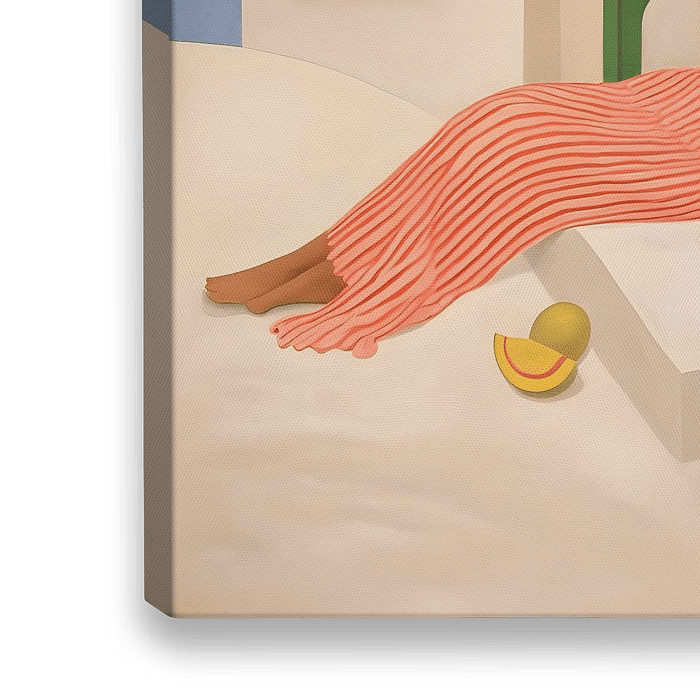 Ibiza Mornings is een kleurrijke illustratie van een vrouw met een gestreepte jurk, ontspannen op een bankje buiten haar huis op Ibiza. Ze geniet van de warme, mediterrane zon die de dag zacht verlicht. Het werk straalt een rustgevende, ontspannen sfeer uit door het uitzicht op de blauwe lucht en de mediterrane boom met terracotta plantenpot. Een waar vakantiegevoel aan de wand!
