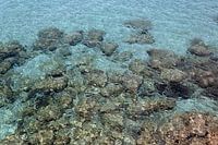 Vanaf de hoge rotsachtige kust kijk je naar de azuurblauwe Balearische Zee. Waarin de stukken steen gevormd worden door het water.
