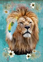 Een hele stoere leeuwenkop met veren en witte bloemen rondom, een beetje een hippie leeuw.