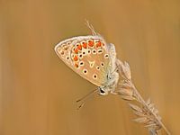 Een prachtig beeld van een Icarus-blauwtje.  Een prachtig beweeglijk vlindertje....Zandkleuren voeren hier de boventoon. Dit vlindertje wordt hier belicht door de avondzon en krijgt daardoor extra 'warmte'. Een zeer fraai natuurbeeld wat rust in uw interieur brengt!