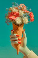 Een gestileerde hand houdt een ijshoorntje vast gevuld met een assortiment kleurrijke bloemen, wat een verrassend element toevoegt aan dit speelse tafereel.
