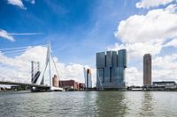 Zicht richting De Rotterdam en de Erasmusbrug aan de Nieuwe Maas in Rotterdam. Van links naar rechts: de Erasmusbrug, De Rotterdam en woontoren New Orleans.