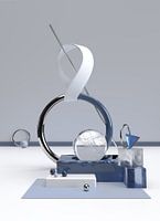 Driedimensionaal (3D) abstract design in moderne kunst met basisvormen en materialen in de kleuren ice, wit en blauw, met metaal accenten. Zie ook Icy Blue 2 om een tweeluik te vormen. Andere kleuren mogelijk op aanvraag.