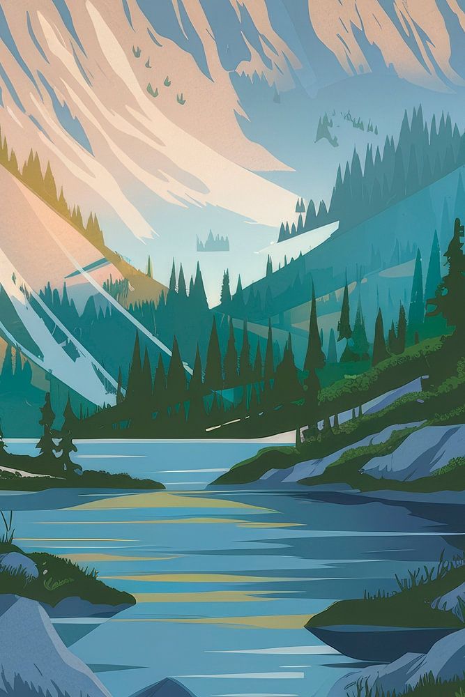 Een adembenemend natuurpanorama ontvouwt zich, met majestueuze bergen die zachtjes in de lucht oprijzen en een glinsterende rivier die door een bloeiend weidelandschap stroomt. Dit vredige landschap ademt rust en avontuur en nodigt uit tot dromen - ideaal voor de woonkamer, waar het inspirerende gesprekken stimuleert en een ontspannen sfeer creëert.