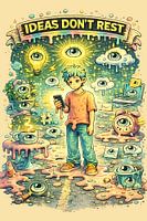 Een rustig moment, omringd door constante signalen en onafgemaakte gedachten. Dit kunstwerk weerspiegelt mentale alertheid die nooit volledig verdwijnt, zelfs niet in stilte. Waarnemende ogen en sprankelende ideeën suggereren een geest die wakker wordt gehouden door zijn eigen nieuwsgierigheid.