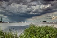 Een van de kleinere Friese meren, de Idsegaasterpoel, met een zware dreigende lucht er boven en de witte zeiltjes in het spaarzame zonlicht die daardoor opvallend oplichten.