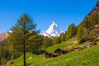 Foto van een idyllisch sprookjeslandschap bij het Aroleidwald onder de beroemde berg "Matterhorn" die hoog boven Zermatt uittorent, in de Alpen van Zwitserland. Ook te zien zijn de groene grasweiden die mooi contrasteert met de blauwe lucht. Een traditionele houten schuur maakt het plaatje af, een prachtige foto voor liefhebbers van Zwitserland.