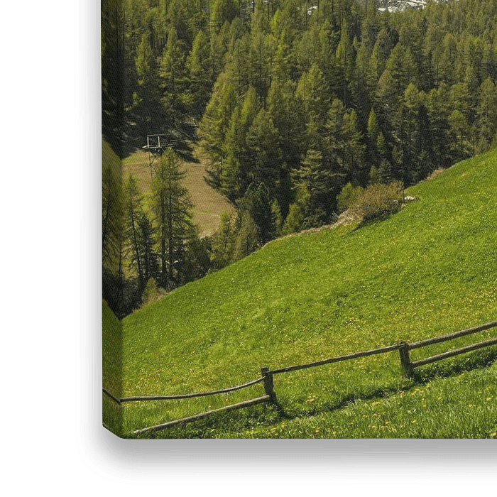 Panorama van een idyllisch sprookjeslandschap bij het Aroleidwald onder de beroemde berg "Matterhorn" die hoog boven Zermatt uittorent, in de Alpen van Zwitserland. Ook te zien zijn de groene grasweiden die mooi contrasteert met de blauwe lucht. Een traditionele houten schuur maakt het plaatje af, een prachtige foto voor…