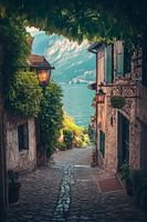 Een betoverd pad slingert zich een weg tussen charmante, met klimop begroeide huizen. Zacht licht van de lantaarns danst op de kasseien, terwijl het glinsterende meer aan het einde van het steegje mysterieuze beloften fluistert. De majestueuze bergen op de achtergrond ronden dit pittoreske scenario af en nodigen je uit om te dagdromen.