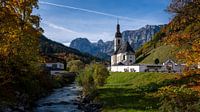 De kerk staat majestueus in het midden, omringd door heldergroen gras, terwijl de majestueuze, ruige bergtoppen op de achtergrond de scène domineren. De compositie wordt versterkt door de snelstromende Ramsauer Ache (rivier) op de voorgrond, die de blik naar de kerk leidt. De warme herfstkleuren van de bomen aan de randen omkaderen het geheel, wat een gevoel van diepte en gezelligheid geeft.