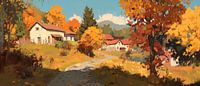 Een schilderachtig pad baant zich een weg door een warme zee van herfstkleuren, omzoomd met fel oranje bomen. De charmante huisjes nodigen uit om te blijven hangen. Dit warme, nostalgische tafereel brengt rust en gezelligheid in de woonkamer en vat de essentie van landelijke idylle. Ideaal voor een retraite in je eigen huis.
